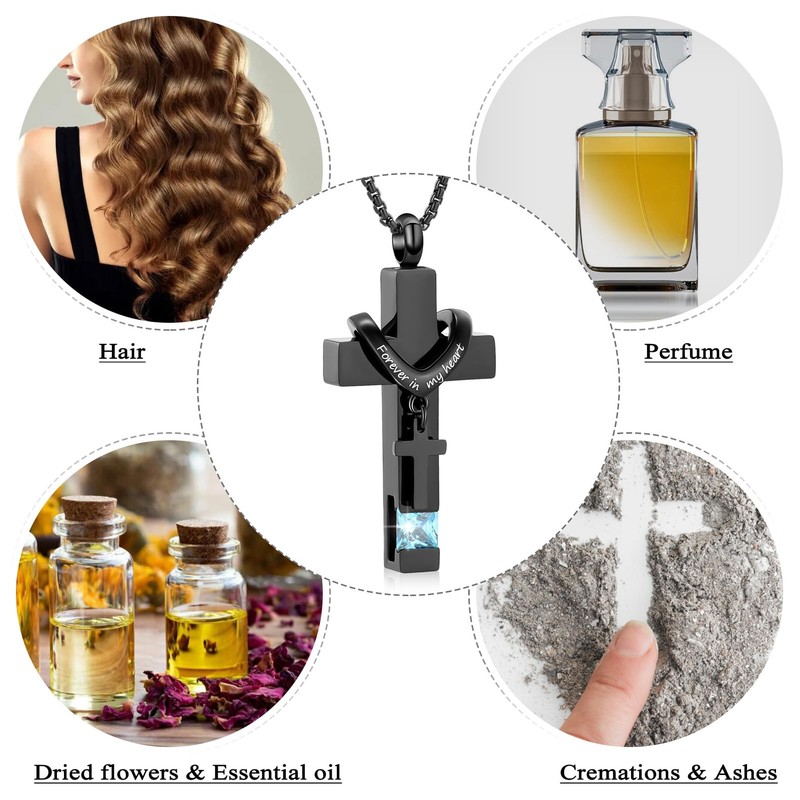 Black Cross Urn Necklace For Ashes Of Loved Ones With Birthstone Always In My Heart Cremation Jewelry Keepsake Pendant Women Men(Light Blue Stone)