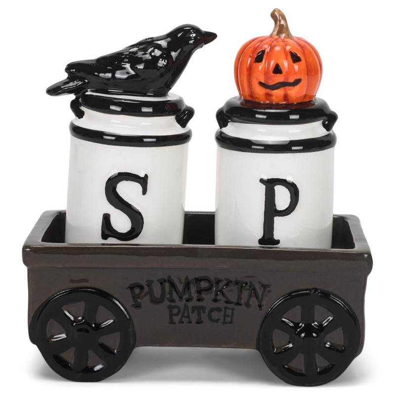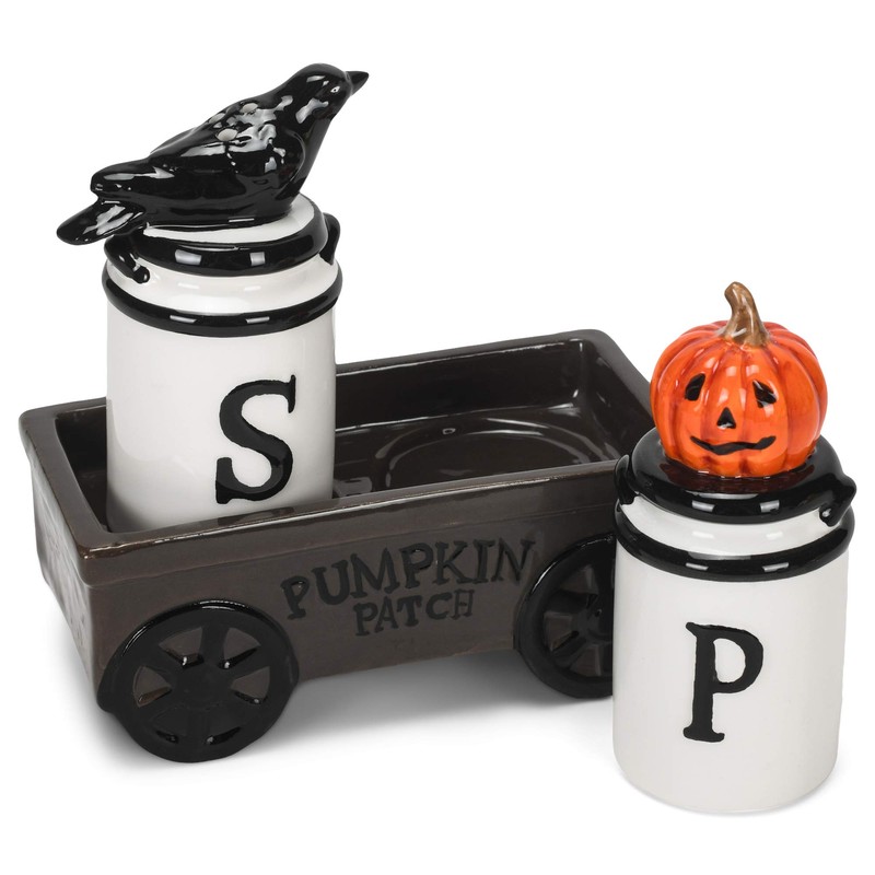 - Add some spooky charm to your living space with these salt and pepper shaker; Shakers are topped with a crow and pumpkin; Features black holder with sentiment "Pumpkin Patch"