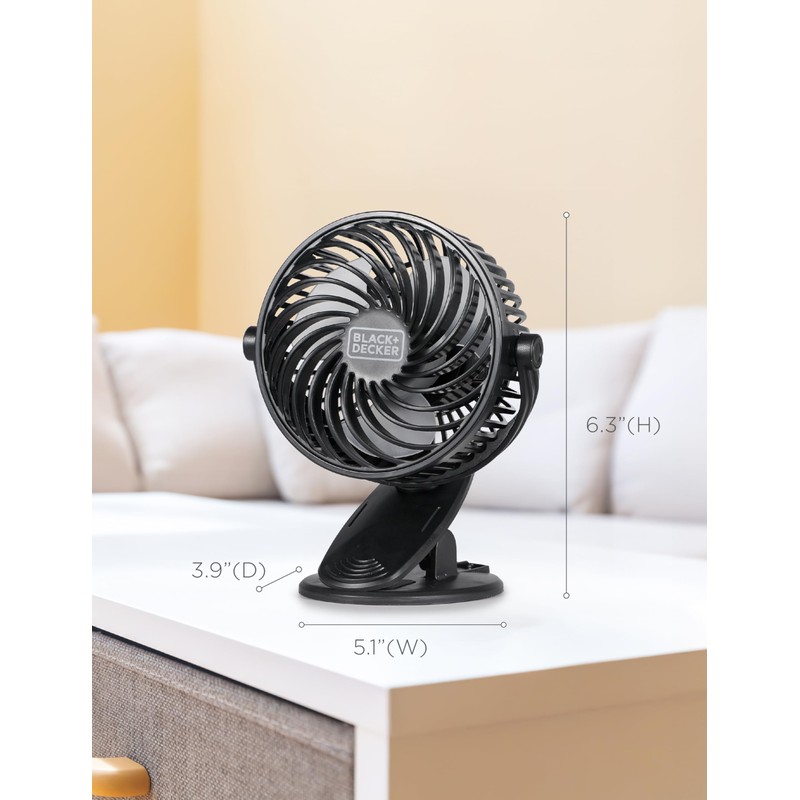 - Clip-On Fan: This mini desk fan (5.1" x 3.3" x 6.5") is also a clip on fan, allowing you to fasten to the edge of your desk, a nearby drawer, end of table, a headboard and other convenient locations.