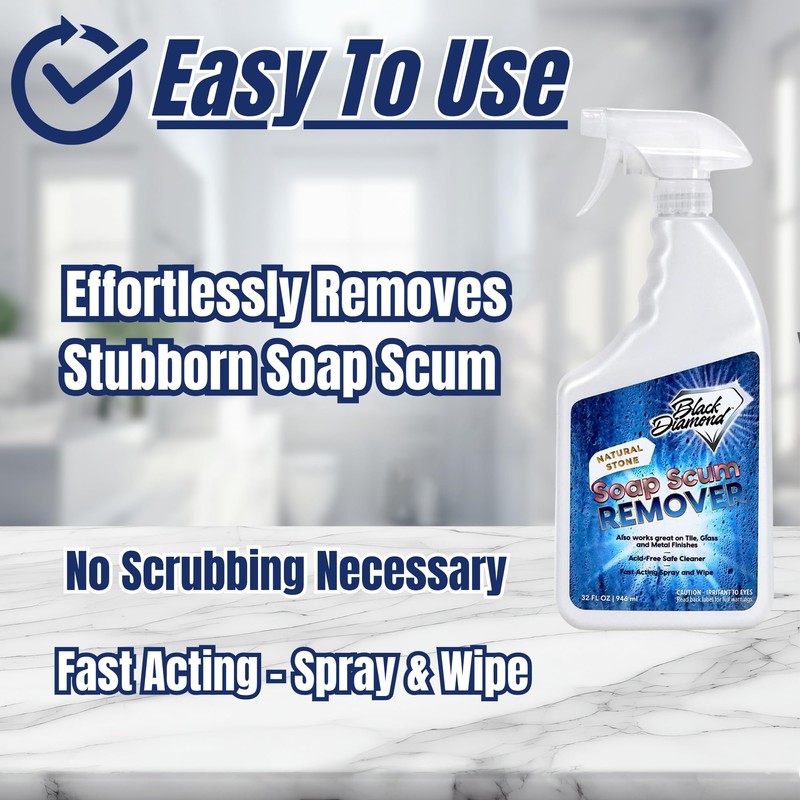 - REMOVES Soap scum, reduces hard water deposit formation, and keeps your shower looking cleaner than ever before. Natural stone is a beautiful accent to any home and should not be covered up by soap scum, so we’re here to help!