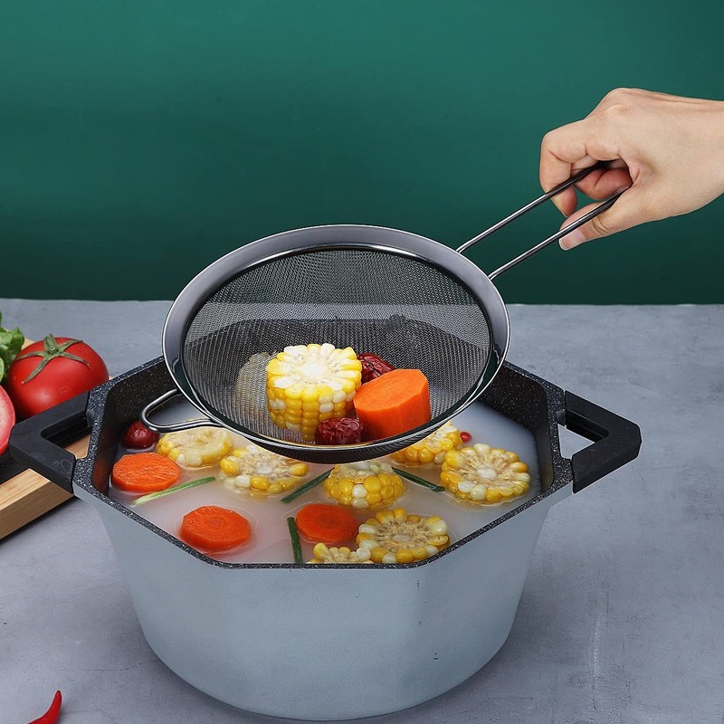 - Fine mesh, quick drainage, easy to clean: the woven net designed by Homquen contributes to the fine, tiny mesh holes. This helps the food drain quickly and retain small particles. It is easy to clean and store with a hinge hook.