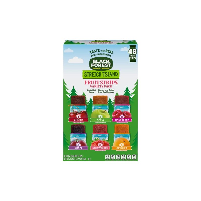 - PACK OF 48, individually wrapped 0.5 ounce strips of Black Forest Stretch Island Fruit Strips in a variety assortment of 6 flavors. Flavors include cherry, apple, strawberry, grape, raspberry, and apricot. There are 8 strips of each flavor in the Variety Pack.