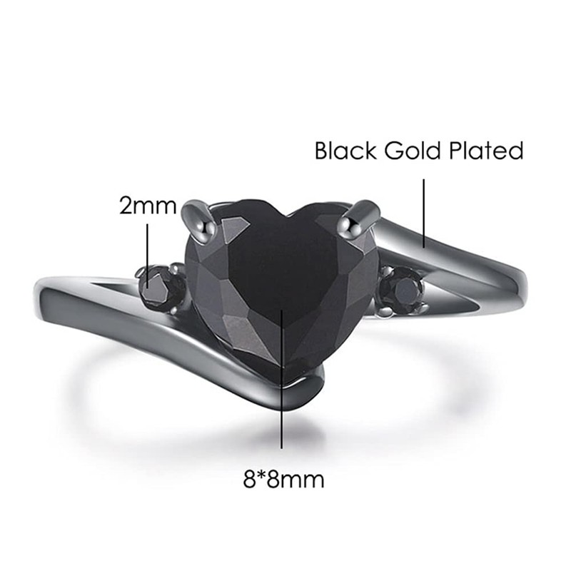 Black Gold Plated Heart Shaped Stone Solitaire Style Wedding Engagement Promise Statement Ring (Full Black, 6)