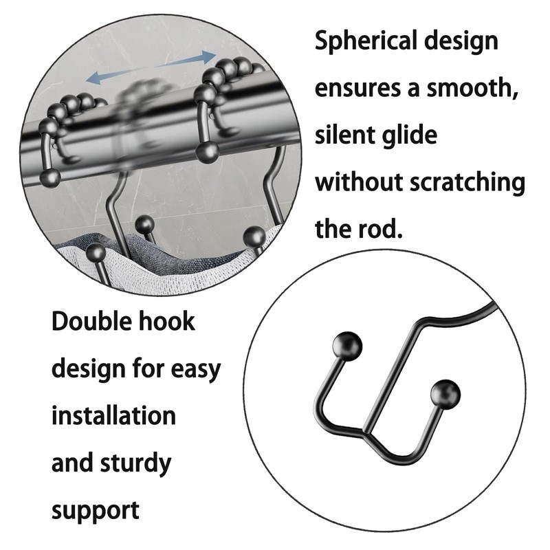 - 🍋Effortless Operation: Experience smooth and quiet sliding thanks to the spherical design of these hooks. They glide effortlessly over your shower curtain rod without leaving any scratches behind, ensuring a seamless shower experience every time.