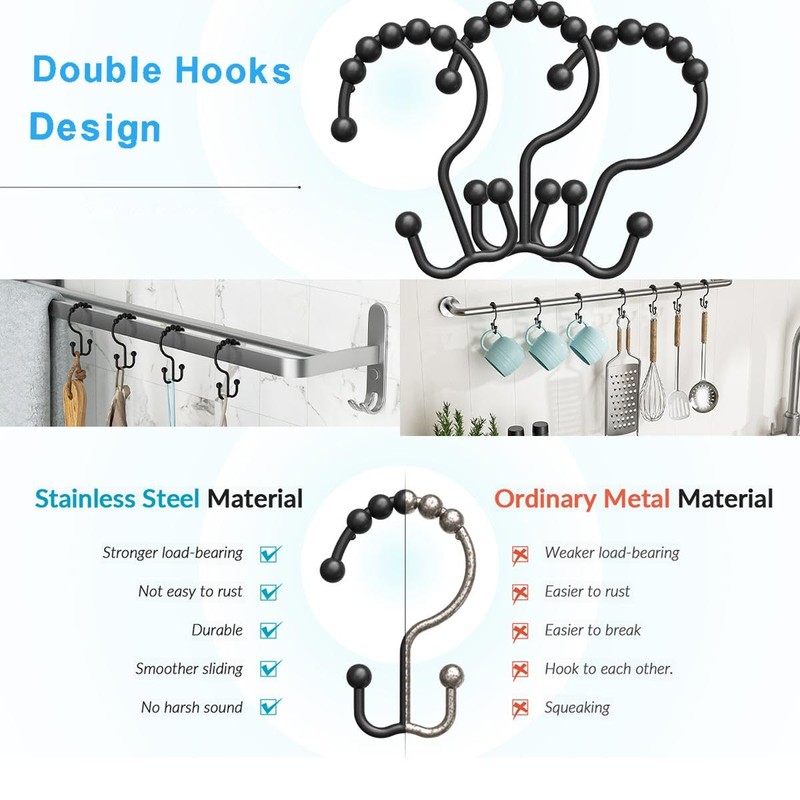 Elevate your shower experience with our black shower curtain hooks. Crafted from durable metal, these hooks are built to last, offering superior rust and corrosion resistance for long-term use. Their sleek design adds an elegant touch to any bathroom décor, while the finely plated and polished finish ensures they stay shiny and new for years to come. Thanks to their double hook design, installation and removal are a breeze, and they're strong enough to support both your heavy shower curtain and liner. Compatible with all standard-sized shower curtain rods, these hooks offer universal fit and effortless operation, gliding smoothly and quietly over the rod without leaving any scratches behind.