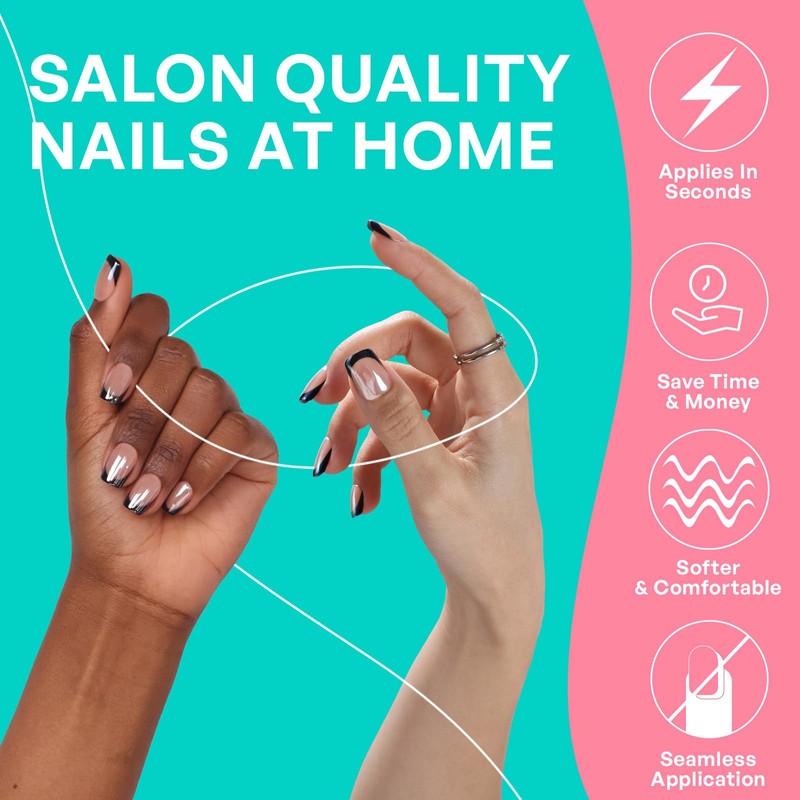 - 【Glazed-Donut Soft Gel Press on Nails】GJZEZ elegant black french tips chrome soft gel fake nails made from a softer & resilient gel-based material. Square Nails are designed to be timeless yet trendy aesthetic, offering a more natural and comfortable fit which complements various hand sizes. Our press on nails for women is a quick and mess-free solution for achieving shiny, chip-free, flawless manicures in minutes.