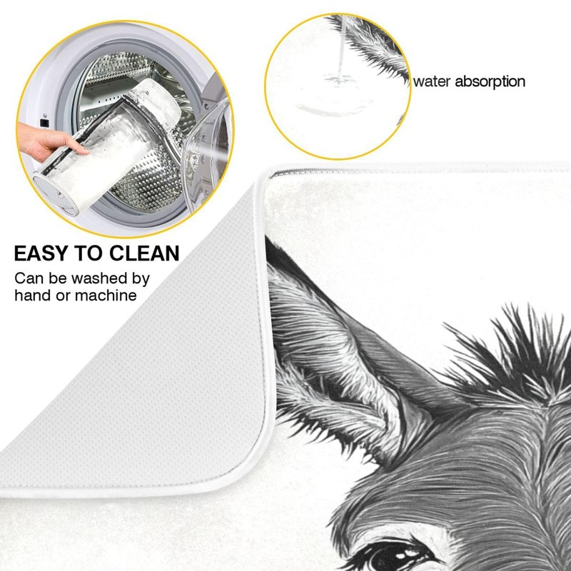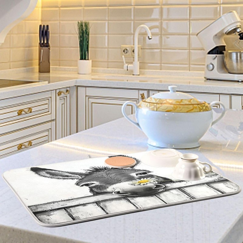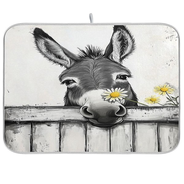 Black White Donkey Flowers Wooden Dish Drying Mat for Kitchen Counter Absorbent Reversible Microfiber Drying Pad Countertop Drainer Mats, Small 16 x 18 inch