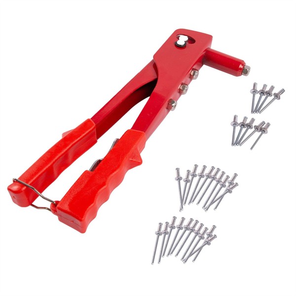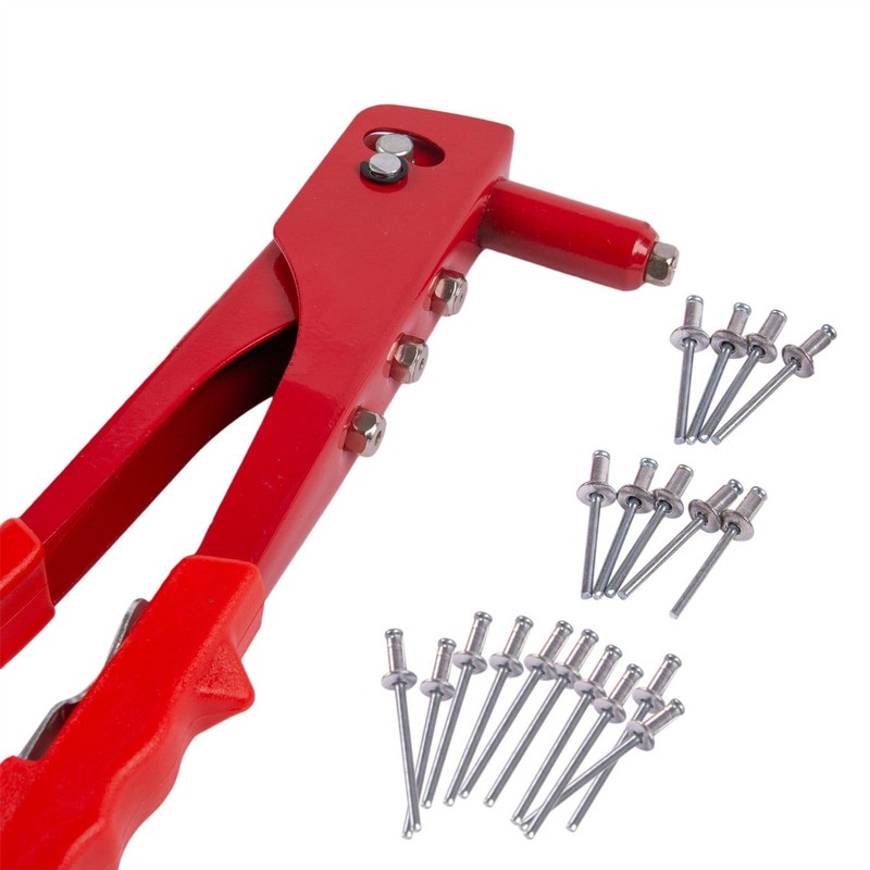 • This hand riveter is manufactured with a metal body plus plastic hand grips & comes with the following assorted sizes of rivets:- 3/32†(2.4mm) 1/8†(3.2mm) 5/32†(4mm) 3/16†(4.8mm)