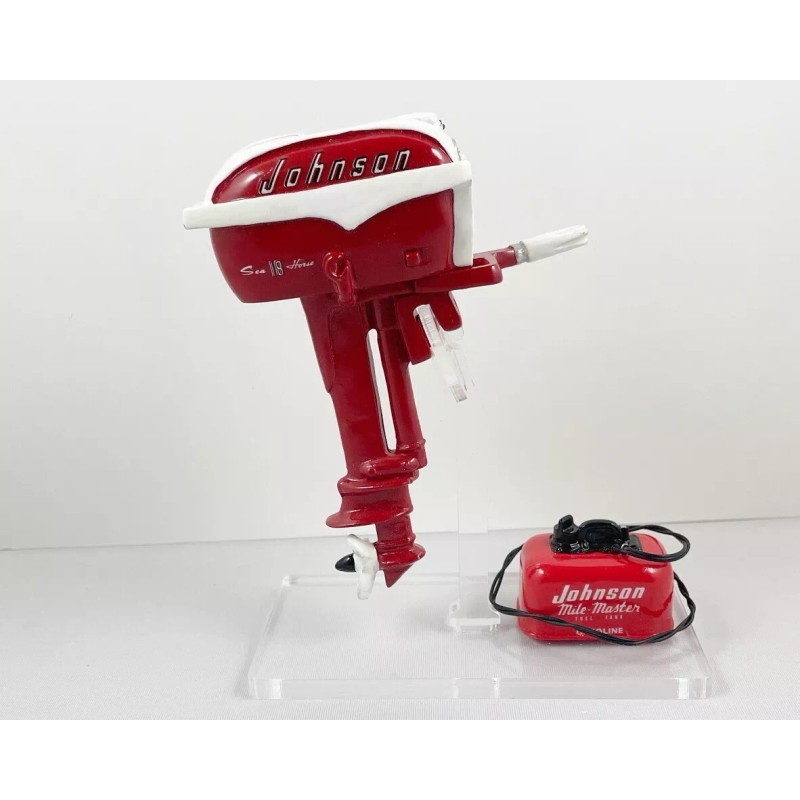 Great reproduction of real Johnson Sea Horse outboard from the 1950s! Motor is 5” high, cast polyresin, hand painted, with authentic period-correct decals. Not really a toy outboard but these words are mentioned to assist with folks searching for these unique motors. Includes matching miniature Johnson Mile-Master gas tank, 1.50” long, with dual “gas lines” (black wires). Static motor, display only (non-functional). Display Stand is clear acrylic, base is 4-1/2” X 2-3/8”, upright is 4” high and top notches secure motor in place.