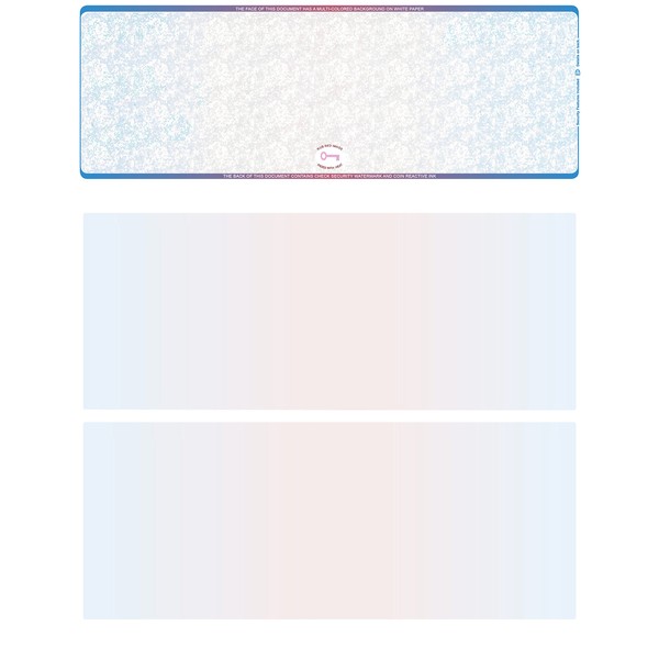 DESCRIPTION: Please note that these checks are blank and contain no personal imprint data. These checks are suited to accommodate accounts payable, payroll and general purpose functions. These checks also have two detachable vouchers allowing you to keep one, and send one voucher to vendor or customer. These High Security laser printer and inkjet checks are guaranteed compatible with all versions of Quickbooks, Quicken, and Microsoft Money. These checks are also compatible with the following programs: ACCPAC Plus, Agency One, ACCPAC Simply Accounting, Alarm Key by Reliable Group, Basic Property Management, Bridge Software. Bedford Integrated Accounting, Deluxe Property Management, Great Plains Profit & Profit With Payroll, Integron Systems, Intuit 7.0, Pacioli 2000, Quick Check, MAS 90, MECA Managing Your Money 10.1, MYOB, Microbiz Retail Store Controller, and many more. WHAT’S INCLUDED: Each order of Blank Blue/Red High Security Computer Checks comes with 250 laser checks. Each sheet comes with one check on the top (8 1/2'' x 3 1/2'') and two perforated vouchers below for convenient record keeping. SECURITY FEATURES: Some security features include: Chemical protection paper; When chemically altered, the area treated will appear as a brown stain or spot. TonerFuse II; Reveals attempted tape lifting or scraping. Micro-printing “MP”; Small type in border, under endorsement area and surrounding Padlock Security box appears blurred if copied or scanned. Check Security Watermark; Absence of the words “Original Document” on the back of this check. Hold at a 45 degree angle. Fluorescent Fibers; Visible only under ultraviolet light. Cannot be photocopied or scanned. Heat Sensitive Ink; Red Image will fade with heat. Rub, hold between thumb and finger or breath on image for reaction. Coin Reactive Ink; Key will appear underneath coin image when rubbed with coin.