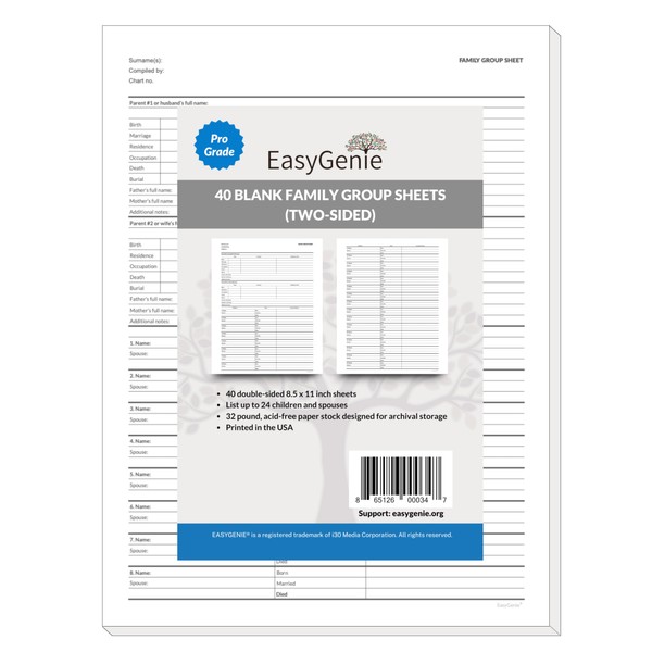 - BIG FAMILIES: 40 two-sided family record sheets included; each sheet can list one couple, their parents and up to 24 children and spouses
