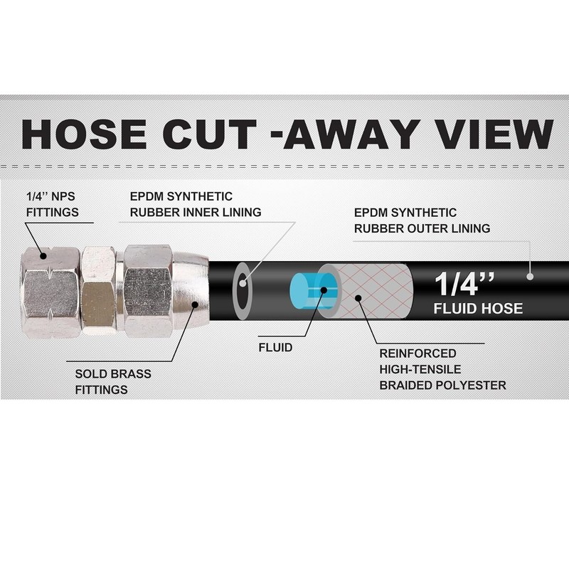 - Fluid Hose Assembly Specifications: Length 25 feet, Internal diameter 1/4" I.D.; Reusable three-piece swivel fitting with 1/4" NPS (F) thread connection. The fluid hose is constructed with an ultra-tough PA-nylon barrier and the inner lining and outer cover are made with the highest quality EDPM synthetic rubber, and the middle layer is composed of high-tensile braided fiber.