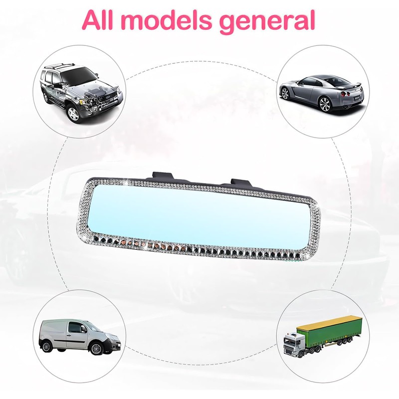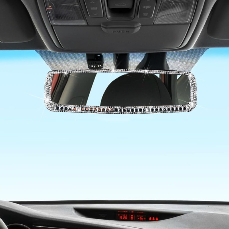 - TOP-GRADE MATERIAL: Our rearview mirror is made of high-quality ABS plastic material with HD glass, covered with bling rhinestones. Upgraded HD glass design has improved clarity which can help to observe the situations in the backseat and behind your car clearly, increase driving and parking safety. And these bling rhinestones are firmly embedded on the mirror, no need to worry they will fall off easily due to long-term using.