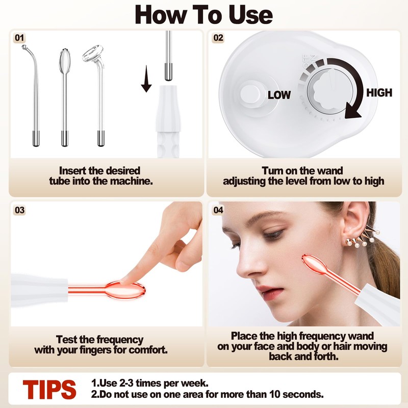 - 【4 Versatile Attachments】The high frequency facial wand comes with 4 purple attachments: the mushroom tube (for larger areas), the comb tube (to support hair growth), the tongue tube (for treatment under the eyes) and the bending tube (for the nose area). Combine them with your favourite skin care products to improve absorption and effectiveness!