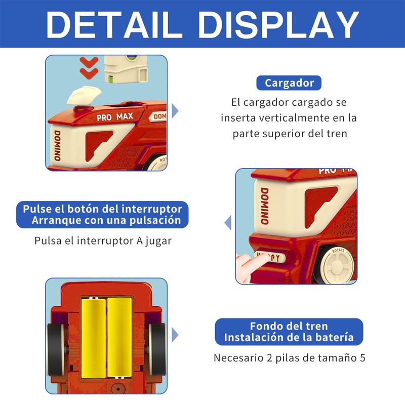 - 🚂 【Función De Colocación Automática】: Coloque las fichas de dominó de forma ordenada y plana en el clip de carga. Coloque el clip largo lleno de fichas de dominó en el tren. Mueve el interruptor y las fichas de dominó se soltarán automáticamente cuando el tren comience a moverse. El juego de bloques de tren de dominó puede establecer rutas de dominó automáticamente para agregar diversión al juego de dominó.
