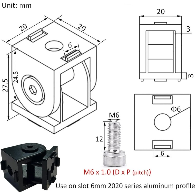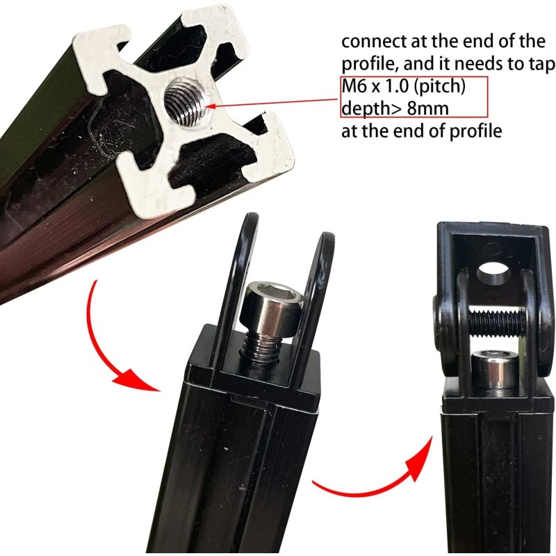 - 20mm x 20mm Aluminum Extrusion Rail end tapping M6x10mm Pitch = M6 x 1.0 to make it possible to connect flexible pivot joint connectors
