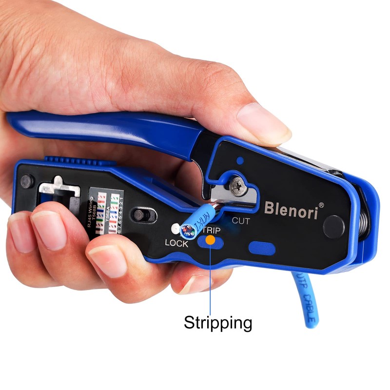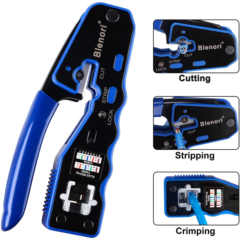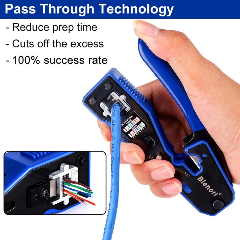 Blenori RJ45 Crimp Tool Pass Through - Ethernet Crimper for Cat5 Cat5e Cat6 Connectors with Mini Wire Stripper