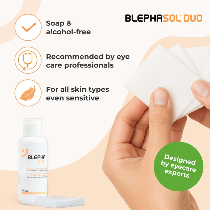 - GENTLE EYELID CLEANSER & LINT FREE PADS : BlephaSol Duo is a hydrating, no-rinse micellar solution for gentle makeup removal and daily eyelid cleansing. With a minimalist formulation ideal for daily use including make-up removal.