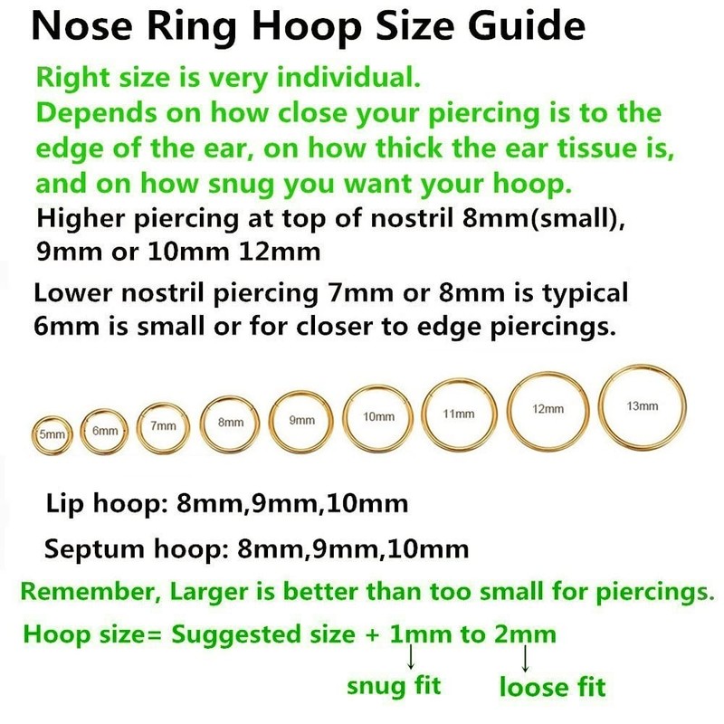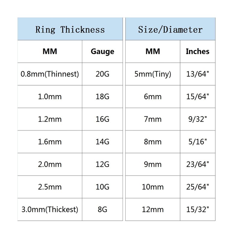 BLESSMYLOVE body jewellery offers the high quality and variety of fashionable piercing jewellery. You can choose nose ring/body piercing ring in 8G, 10G, 12G, 14G, 16G, 18G and 20G, with the inner diameter in 6 mm, 7 mm, 8 mm, 9 mm, 10 mm, 11 mm, 12 mm, 13 mm, 14 mm and 16 mm.