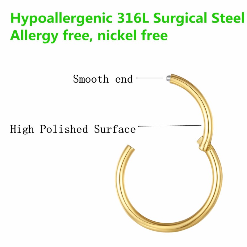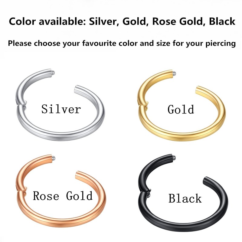 • Intended use: This hinged hoop can be used as a nose ring. Nose ring, nose piercing, septum ring, septum piercing, ear piercings, earrings, helix earring, cartilage earring, shell earrings, shell piercing jewellery, rook earring, lobe earring, daith earring, ear piercing, lobe piercing hoop, helix piercing jewellery, tragus earring, lip piercing.