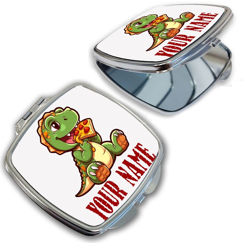 Bleu Reign Compact Personalized Pocket Mirror Custom Name Dinosaur Eating Pizza