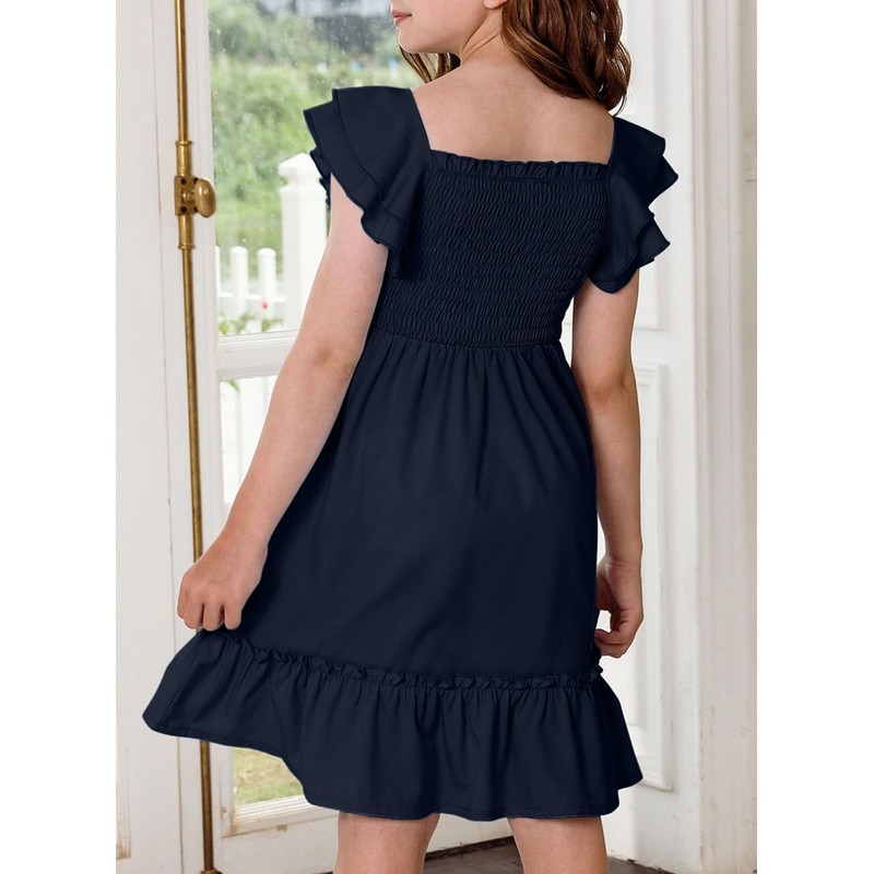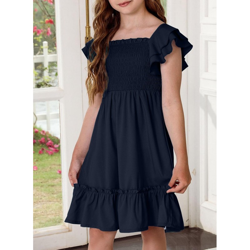 blibean Tween Girls Summer Dress Kid Ruffle Short Sleeve Dresses Solid Semi Formal Dressy Clothes Boho Fancy Party Outfit Size 10-11 Years Old Navy Blue