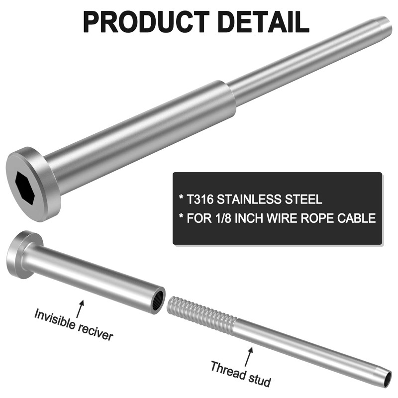 - 【SIZE】4"x4" Invisible cable railing kits fit for 1/8 inch stainless steel wire rope cable. Overall length of the receiver: 1.75", Threaded stud length: 2.98", Thread: 1/4-20. Min length: 3.73", Max length: 4.59".