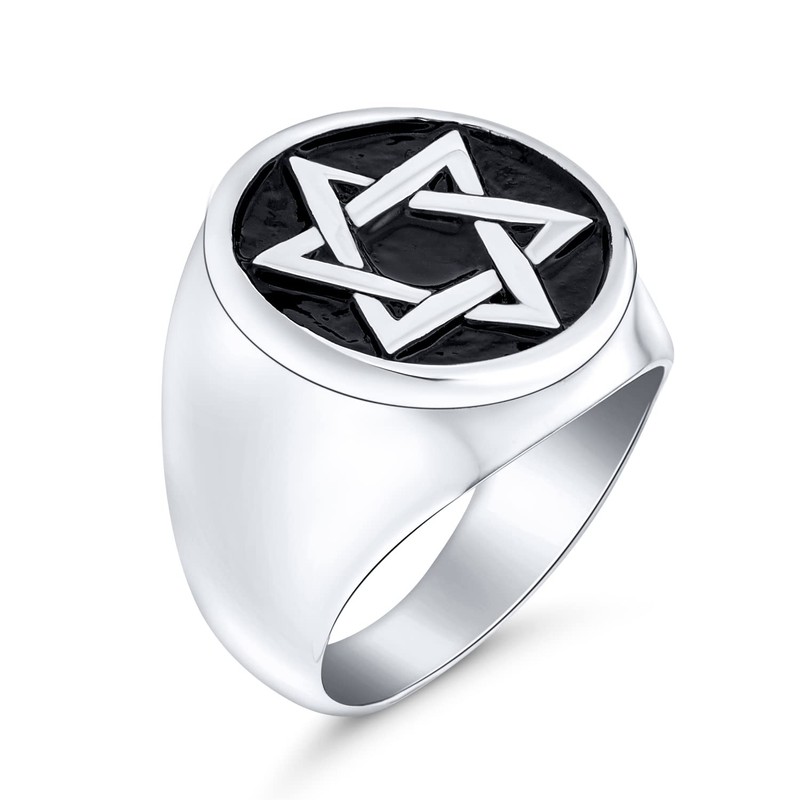 - Celebrate your Judicia heritage with our stylish men's Star of David ring. Perfect for Bar Mitzvah gift, Passover or Hanukkah, this modern design features a captivating star enclosed within a sleek round frame, crafted from durable stainless steel and adorned with black enamel is solid heavy and will help him to express his faith in style. With its masculine and bold aesthetic, this ring is sure to become a cherished mystical symbol for any man.