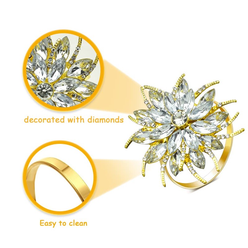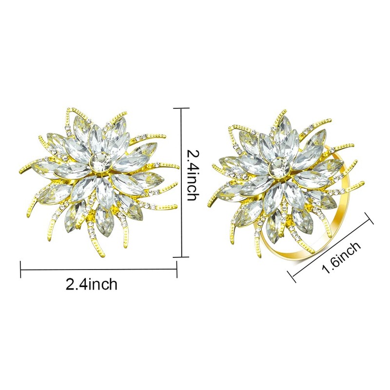 - Package Includes:Our luxury gold bling flower napkin rings come in sets of 6. The napkin holder gold size is 1.6 inch in diameter and the flower is about 2.4 inch in width. It can be applied to many different types of napkins.