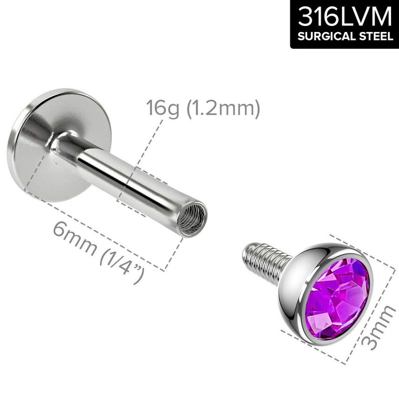 - SUPERIOR 316LVM SURGICAL STEEL - These 16g cz labret stud earrings 8mm are hypoallergenic, lead-free and nickel-free. The construction of the labret amethyst jewelry is corrosion resistant, bio-compatible and easy to clean. The cubic zirconia labret brigh