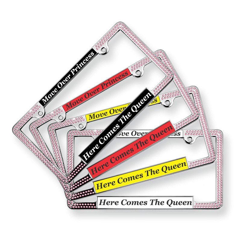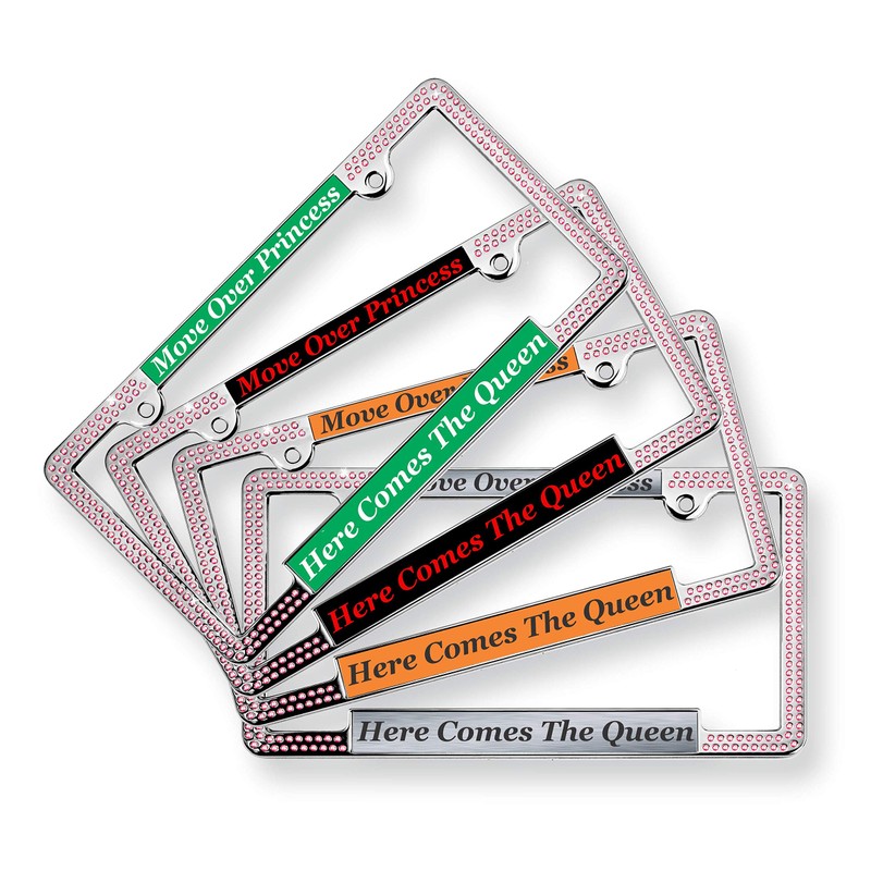 - PREMIUM QUALITY - Our Best-selling CAR 2-hole Standard USA Size - Chrome Metal with Pink Crystals License Plate Frames are made to fit 12" x 6" Car license plates. Each frame has 2 Top mounting holes and 2 securing tabs on the back side of it to keep your license plate in place and prevent it from rattling. This Metal Chrome personalized license plate frame is Very Durable, UV stable, Weather resistant and made to last. It will not break at the car wash and withstand any weather conditions.