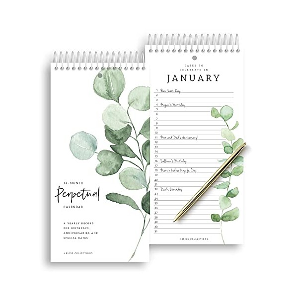 Bliss Collections Perpetual Calendar, Important Dates to Remember, Greenery Monthly and Daily Wall Hanging Organizer for Important Dates, Birthdays, Anniversaries and Special Days, 5"x10" (12 Sheets)