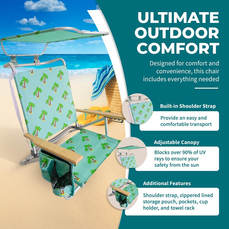 Bliss Hammocks Folding Beach Chair, Backpack Recliner with Canopy, Palm Tree