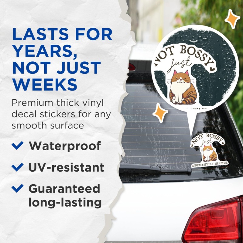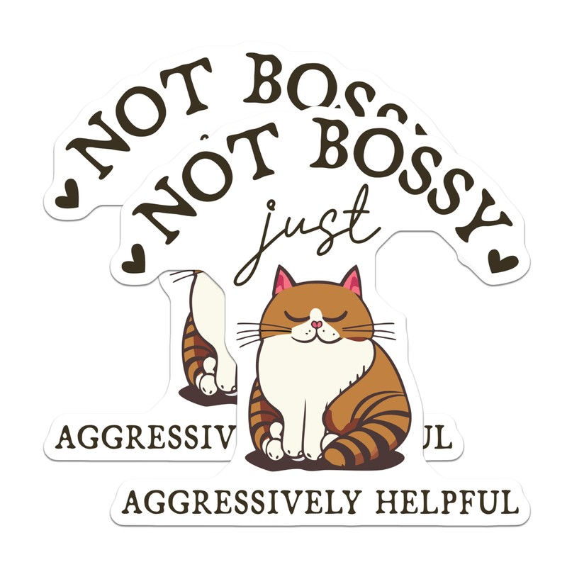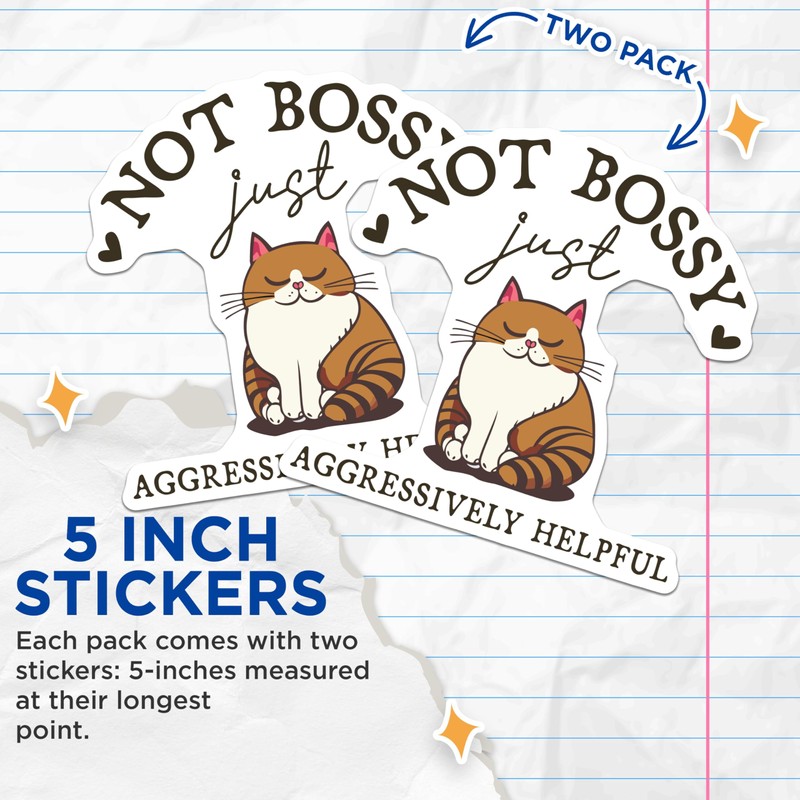 Bliss Monkey Co. (2 Pack) Not Bossy Just Aggressively Helpful Cat Stickers - Multicolor Vinyl Rectangular Cartoon Stickers - Ideal for Metal, Plastic, Glass - 5" Longest Side - Made in USA
