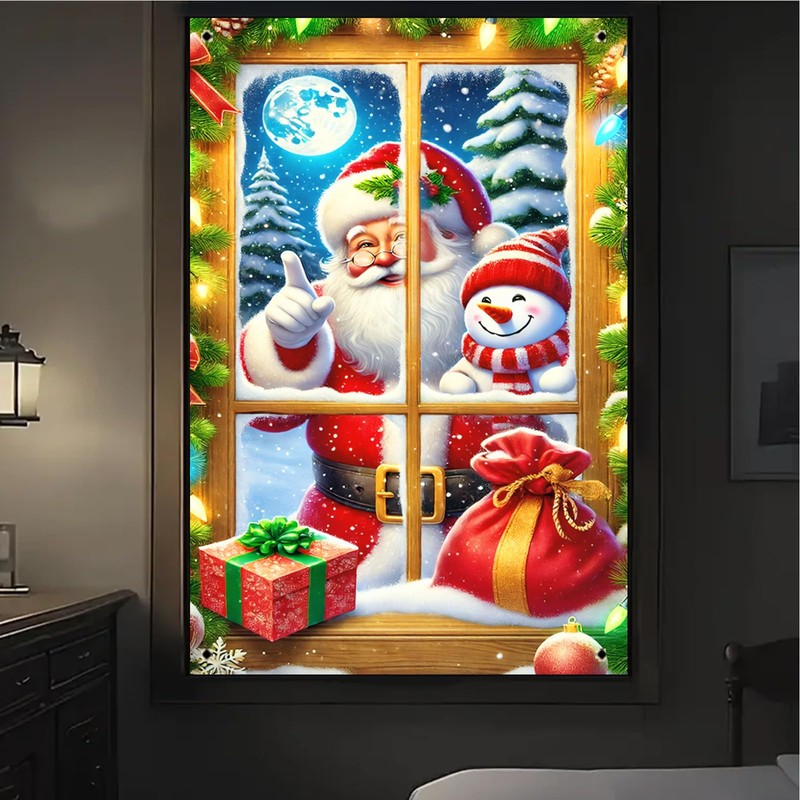 - Classic Christmas Scene Design: Featuring Santa Claus and a snowman in joyful interaction this window banner blends festive warmth with classic winter elements like gift boxes snow covered pine branches glowing lights and snowy night sky perfect for holiday window or wall decor