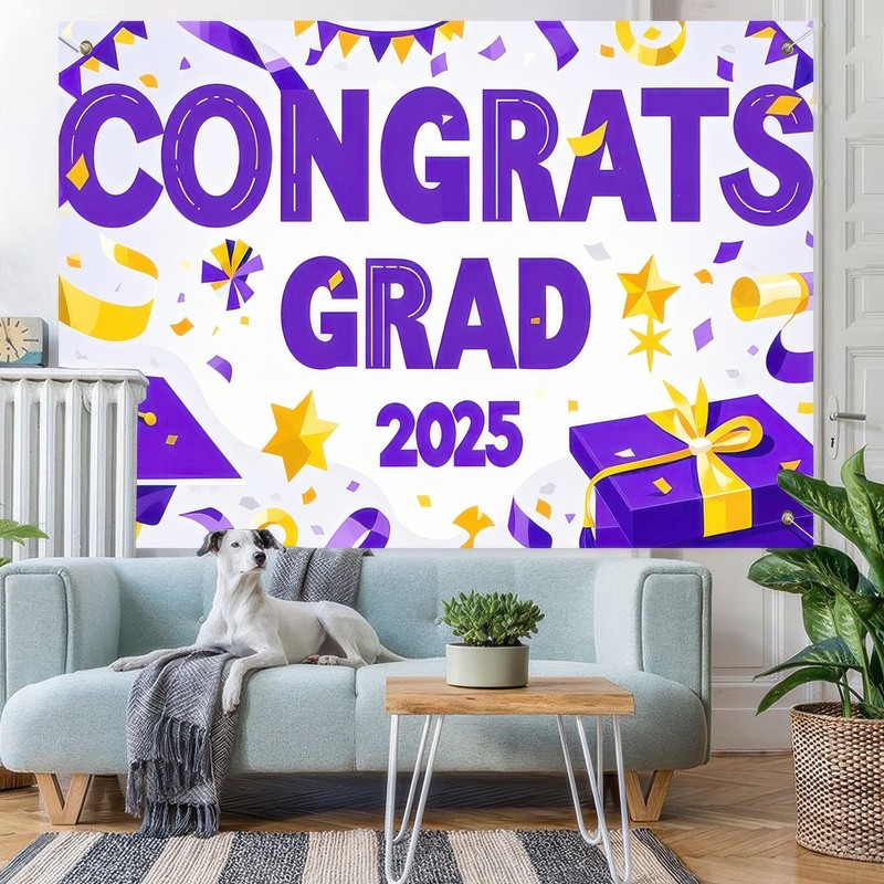 - Celebratory Design for Graduation:This eye-catching banner features "Congrats Grad" and "2025" with festive elements like graduation caps, confetti, and stars. Its vibrant purple and yellow color scheme adds energy and excitement to any graduation celebration.
