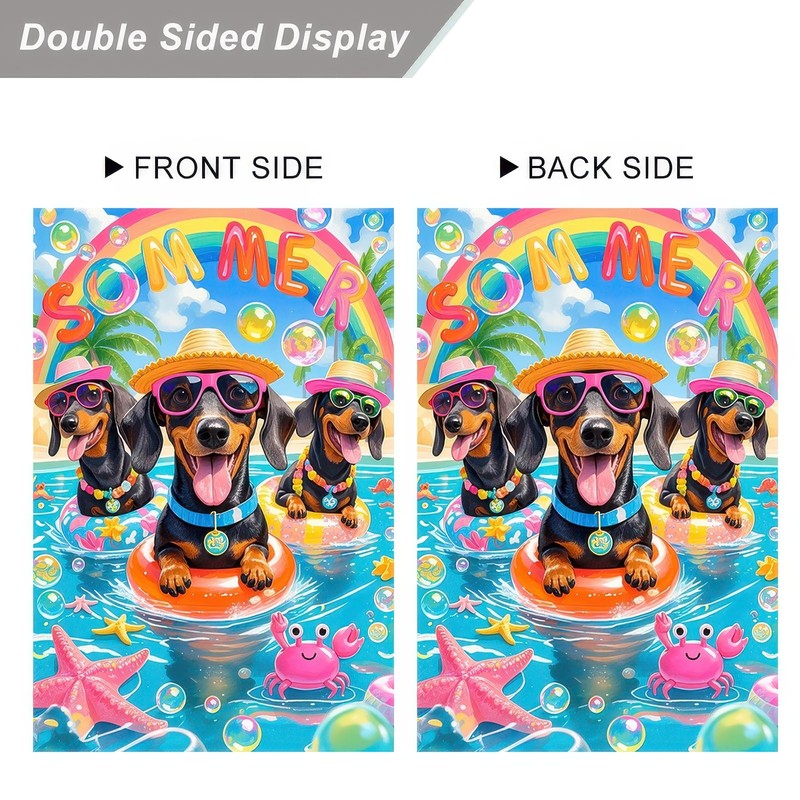 - Playful Summer Design:This Beach Tropical Summer Dachshund Garden Flag features three adorable dachshunds enjoying a day at the pool on inflatable rings, complete with sunglasses and hats, capturing the essence of summer fun.