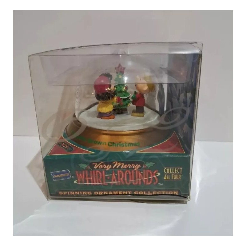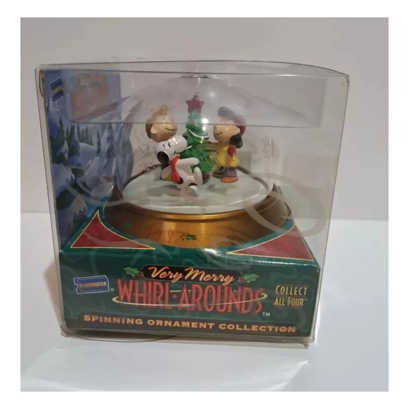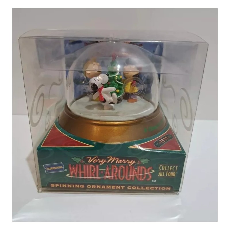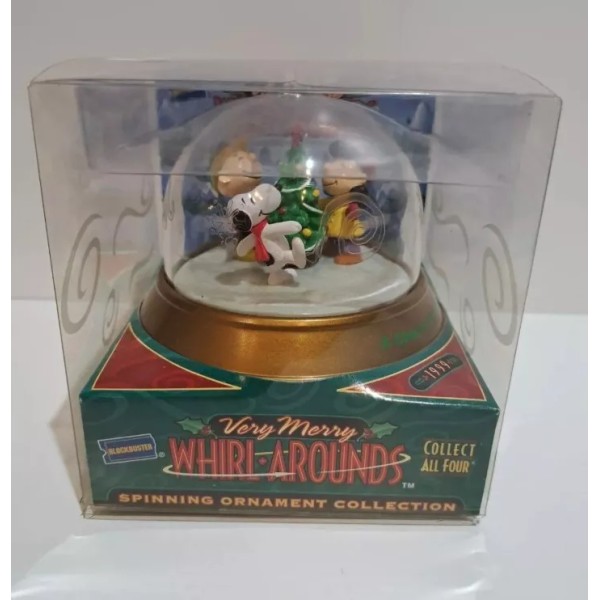 1999 Peanuts Very Merry Whirl Arounds Blockbuster Spinning Christmas Ornament. Plastic outer box does have dust, light scratches or small dings from storage. FAST SHIP OUT!!!