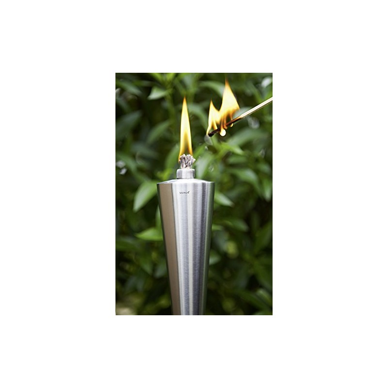 At blomus the modern Stainless Steel Outdoor Garden Torch - Cone with Beechwood Stake takes the old fashioned Tiki Torch to an extraordinary level. This brushed stainless-steel garden torch is very versatile when set in the garden with the ground spike, or used on a balcony or terrace with a torch stand. We offer a variety of styles to compliment the modern outdoor garden. Pole is 46 1/2'' tall x 7/8'' diameter with 11'' torch. 2 3/4'' x 2 3/4'' x 59 3/4''.