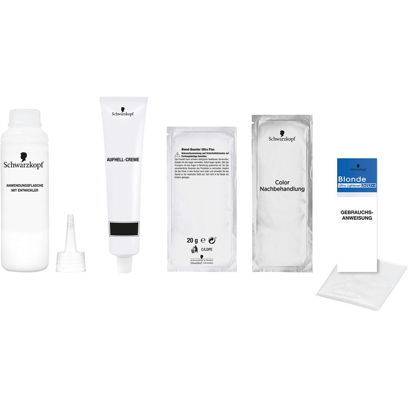 - 1 tube of whitening cream 50 ml, 1 application bottle with developer lotion 50 ml, 1 sachet blonde booster ultra plus 20 g, 1 sachet colour treatment 22.5 ml.