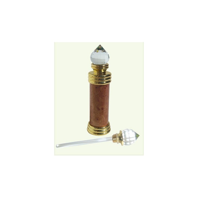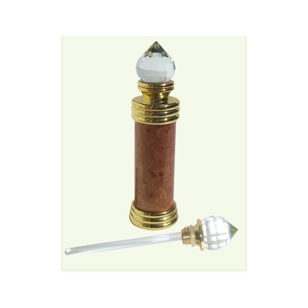 - comes in a Decorative Perfume Bottle with Metal and Beads, Screw-on Gold cap with Glass Applicator.