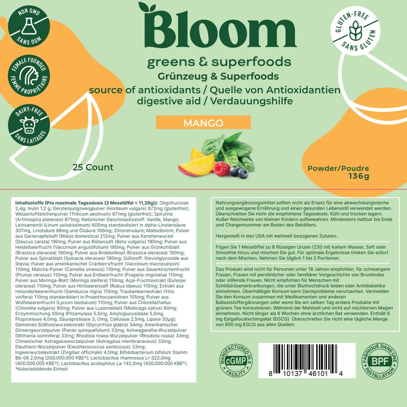 - DELICIOUS TASTE We at Bloom love the taste. That's why we believe that your preferred supplements should be made from high-quality ingredients that support your health and taste delicious. Greens are super refreshing, like a light fruit juice that is so good that you will look forward to drinking it daily!