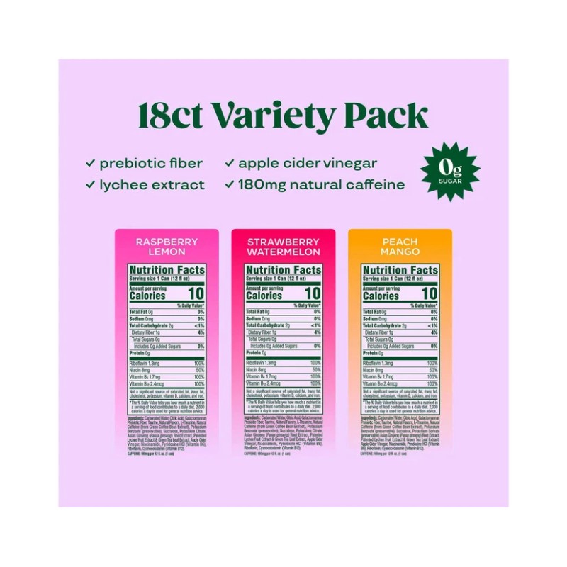 Enjoy a variety of your favorite flavors all in one pack. This pack includes Strawberry Watermelon (6 cans), Raspberry Lemon (6 cans), and Peach Mango (6 cans). Each flavor is distinct and refreshing, offering a unique taste experience with every sip.