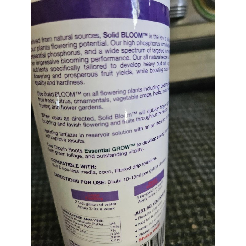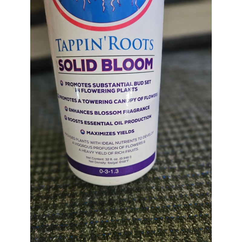 Tappin' Roots solid bloom 1 Liter is an organic fertilizer designed for all-purpose plant care. It comes in a liquid form and is suitable for use in home gardens, yards, and outdoor living areas. The fertilizer is made by Bloom, a reputable brand known for producing high-quality plant care products.