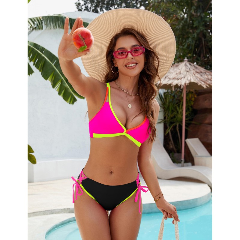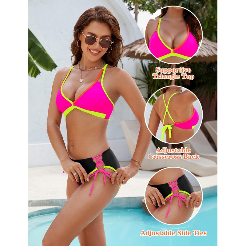 - Sexy Bathing Suit: 2 piece swimsuit for women features bikini top with removable soft cups, triangle silhouette, plunging v neck, and wide straps that form a crisscross back, as well as a matching hipster bikini bottom with mid rise waist and adjustable lace up sides, which is sexy and flattering.