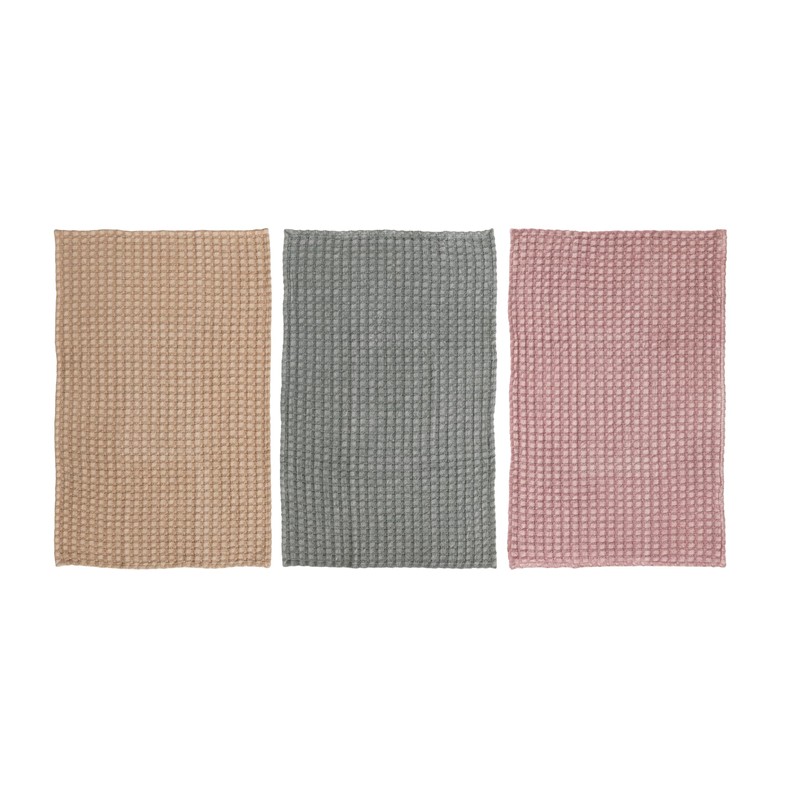- A beautifully textured oversized cotton tea towels, featuring a soft stonewashed waffle weave in three distinct colors