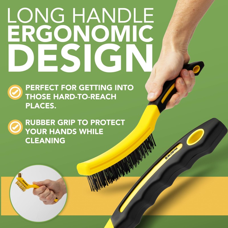 - REACH WHERE OTHERS CAN'T - Thanks to the extended handle, our wire brush for rust removal set effortlessly gets into those tricky, hard-to-reach spots. Clean behind appliances, inside vehicles, and more with ease. Whether it's metal, wood, concrete, or brick, our wire cleaning brushes deliver outstanding results.