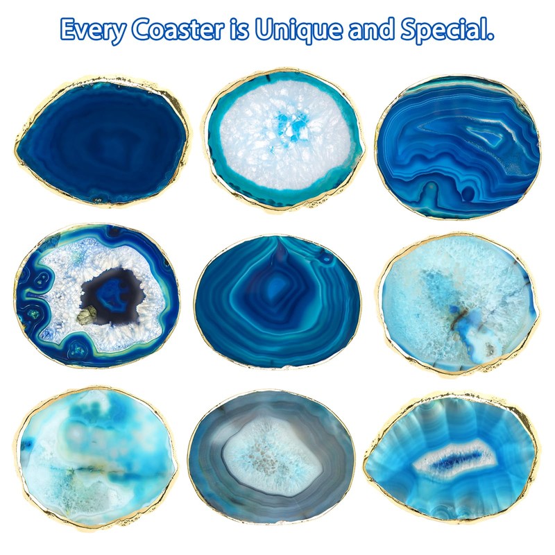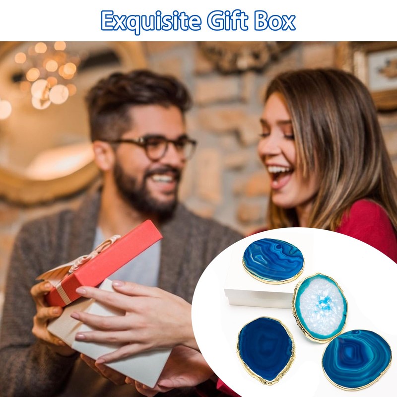 Blue Agate Coasters Set of 4 with Gift Box, Luxiv 3-4" Agate Coasters for Drinks Natural Crystal Coasters with Gold Edge Brazilian Geode Stone Coaster for Coffee, Drinks, Tea (Blue, 3-4 inches)