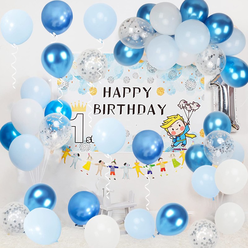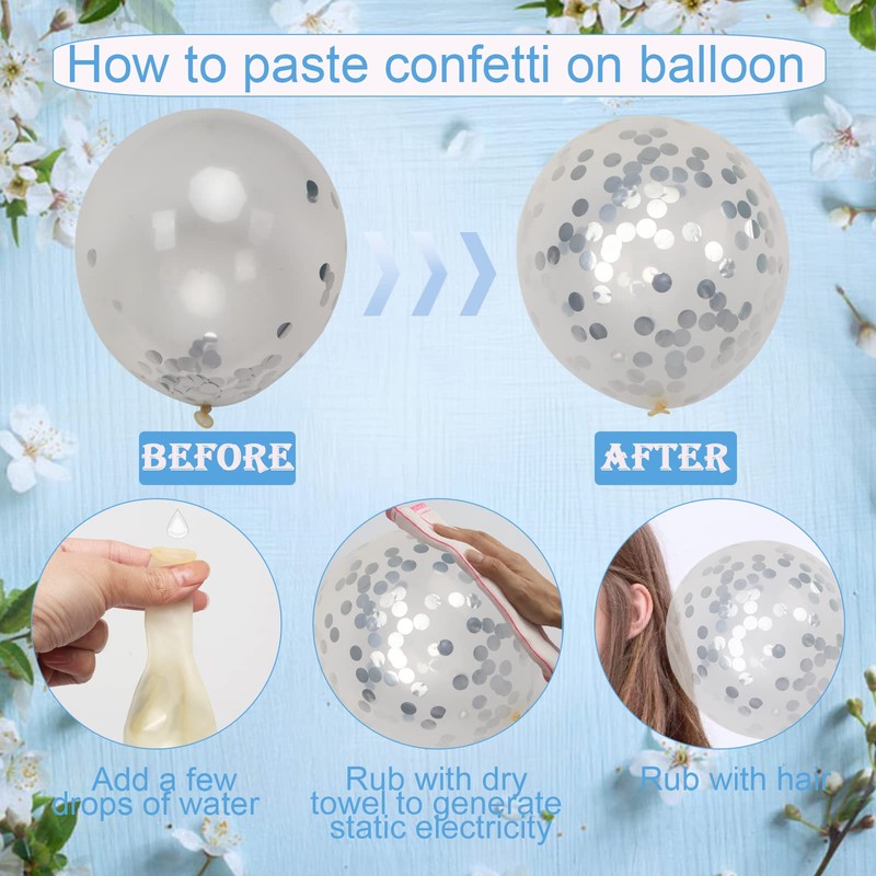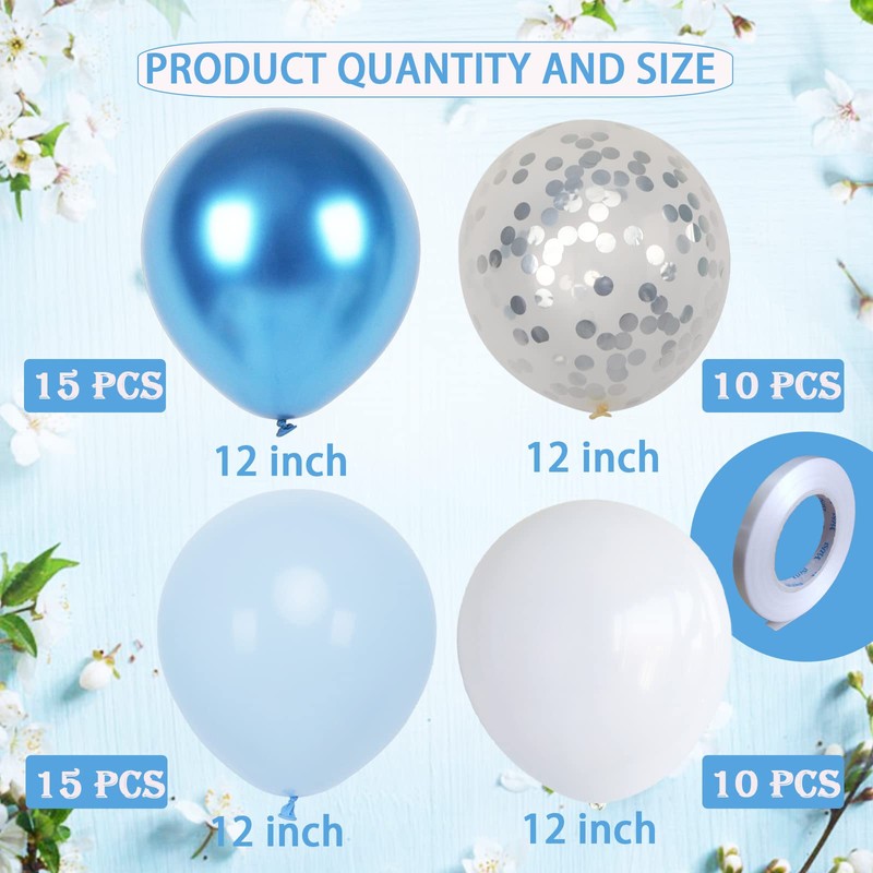 - What You Get: This multicolor confetti balloon set includes 15 Blue metal latex balloons, 15 light blue latex balloons, 10 white balloons, 10 silver confetti balloons, and 1 white ribbon.