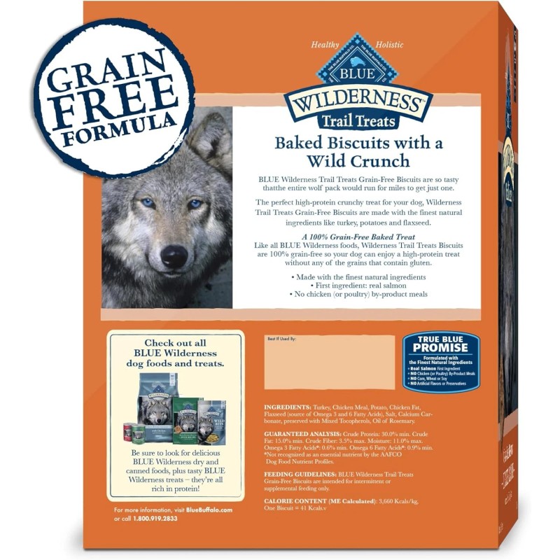 A perfectly crunchy dog treat for meat-loving dogs, BLUE Wilderness Trail Treats High-Protein Crunchy Dog Biscuits feature real turkey as the first ingredient. These high-protein and grain-free dog treats are made with the finest natural ingredients. Bring out the wolf inside your dog with tasty turkey, potatoes, and flaxseed packed into every bite. Like all Blue Buffalo dog treats, these treats for dogs don't contain chicken (or poultry) by-product meals, corn, wheat, soy, artificial flavors, or preservatives. Watch your dog's tail wag when you reward them with BLUE Wilderness Trail Treats High-Protein Crunchy Dog Biscuits.